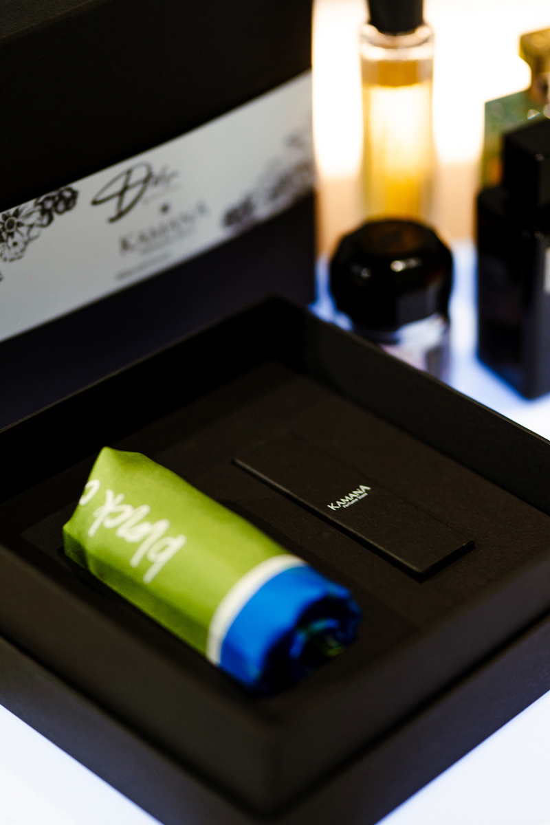 Шовк і аромат завжди гармонійно доповнюють одне одного – тактильно, візуально і відчутно. Унікальний принт і хустка розроблені художницею Ольгою Дворянською, засновницею бренду D. OLYA – відомого українського виробника ексклюзивних шовкових аксесуарів і авторських подарунків.